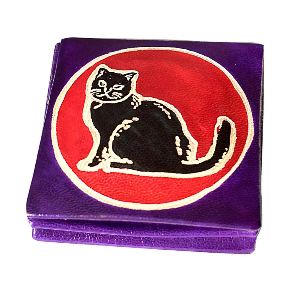 Brightly coloured coin purse with embossed cat. Square box with press stud fastening.